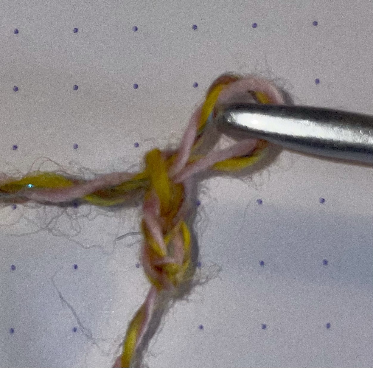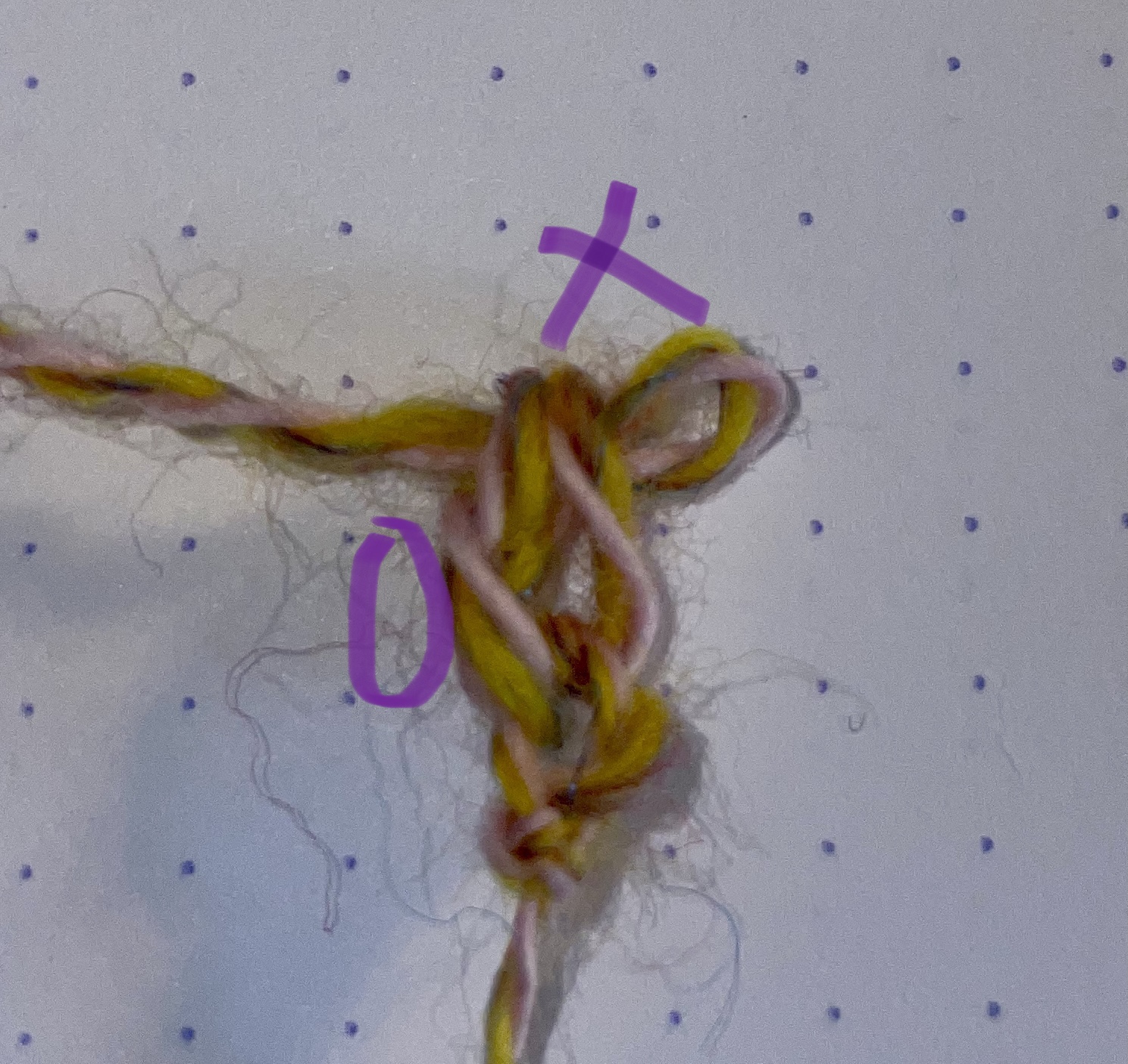 Don’t worry at all if at this stage you have what appears to be a very carefully crafted knot. On this picture the 0 is the fake chain, and the X is the double crochet. It helps to stretch it out a bit and get a good look.