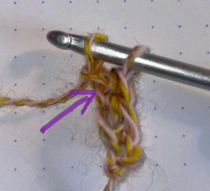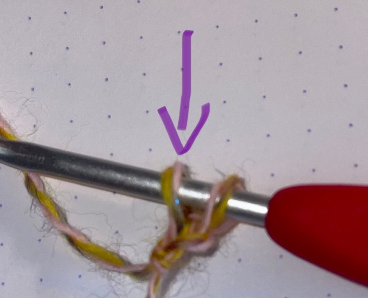 Your next stitch is going to be worked into the fake chain marked with the 0, so insert your hook, yarn over, pull through a loop and repeat the steps above.