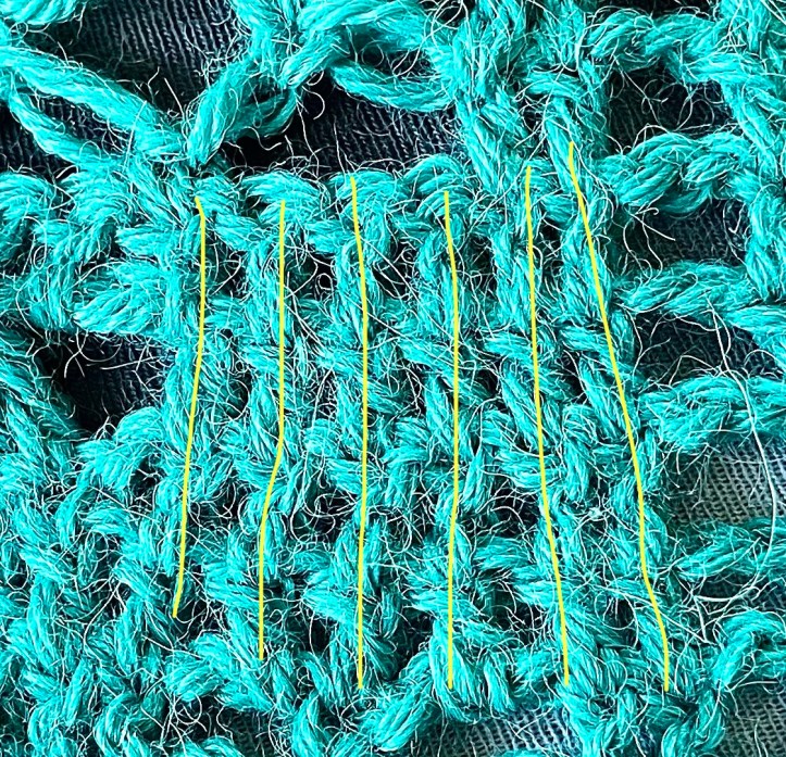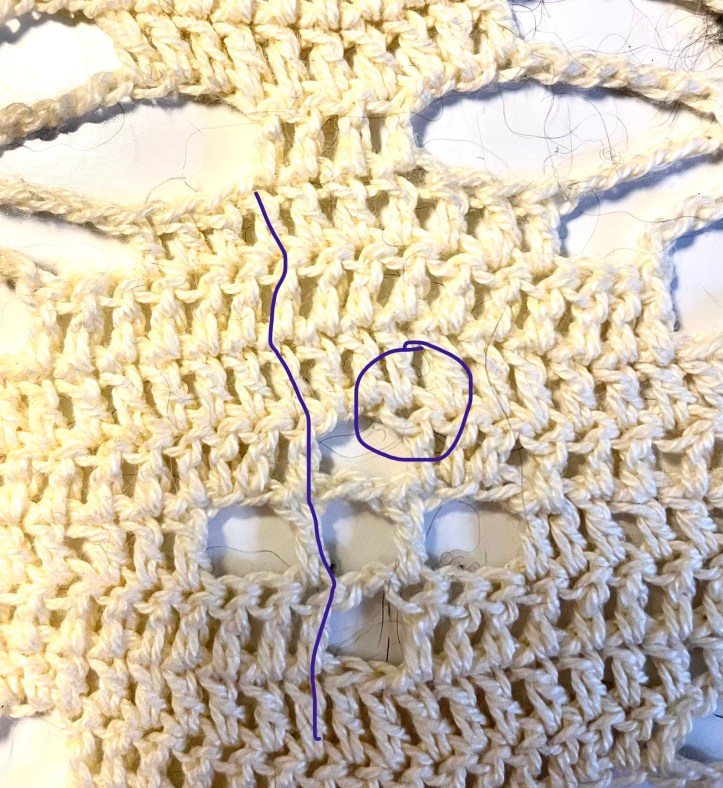 This is a filet crochet piece from a few years ago that I was super proud of at the time, I mean I love it, it’s worn and washed well, but I look at it now and cringe. If you look at the line of stacked stitches, because every one is off centre, and working in rows of course means that every row is off centre in the opposite direction… you get a wibbly wobbly line.