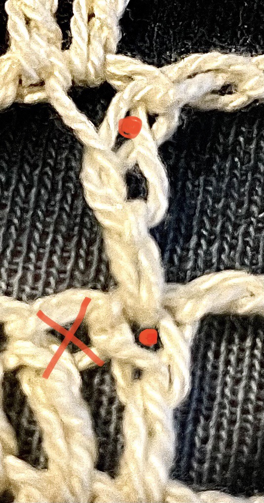 Now don’t get me wrong, working into that space has a lot of advantages, it’s easier for a start, and the crochet fabric that you have at the end has good drape and stretch. If you are making something though that has really defined lines, like filet crochet, if you don’t lock at the very least the first and last stitches in each square, when you block the finished piece you will never get those really crisp effects and it will just look a bit sloppy.